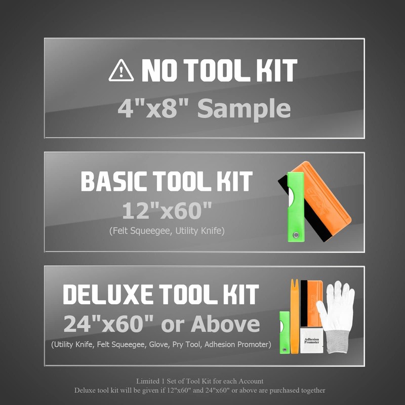 - We provide a free tool gift set for size larger 4"x8" size. Size 4”x8” DO NOT come with Tool Kit. Size of 12”x60” Include 1 set of Basic Tool Kit. Size 24”x60” and above Include 1 set of Deluxe Tool Kit. And we Limited 1 Set of Tool Kit for each buyer ONLY regardless of quantity purchase. Deluxe tool kit will be given if 12"x60" and 24"x60" or above are purchased together