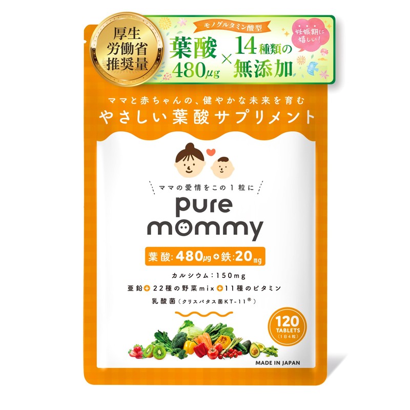 【厚生労働省推奨の葉酸480μg配合】 葉酸 × 妊活 サプリメント ピュアマミー モノグルタミン酸型 葉酸サプリ 30日分 無添加 鉄 カルシウム ビタミン11種 ミネラル 国産野菜22種 妊娠 妊婦 Pure mommy 悩み解決ラボ