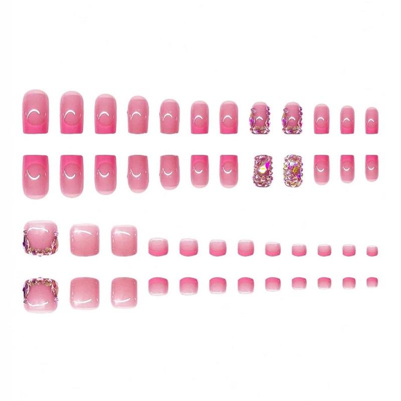 48Pcs Square Press on Nails Short & Press on Toenails Set, Pink French Tip Press on Nails with Rhinestone Design Fake Nails Short Press on Toe Nails for Women Manicure Kit