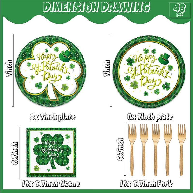 - Suitable for occasions:Fork dessert plate and napkin set is suitable for Saint Patrick's Day themed parties,Saint Patrick's Day themed birthday parties,Baby shower,Shamrock theme party,Holiday trips, etc. which will make your party more Interesting and attractive, and leave deep memories for your guests and more compliments.