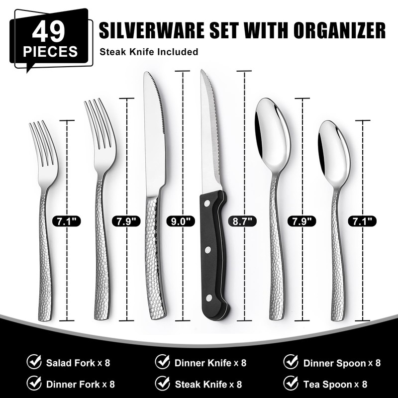 49-Piece Hammered Silverware Set with Organizer, Heavy Duty Stainless Steel Wave Flatware for 8, Cutlery Utensil Sets with Steak Knives, Rust-proof, Mirror Polished, Dishwasher Safe