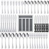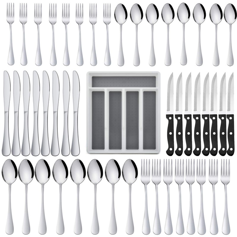 - SERVICE FOR 8 - 49-piece silverware set includes 8 of each: Dinner Spoon, Teaspoon, Dinner Knife, Dinner Fork, Dessert Fork, Steak Knife, Plus 1 durable plastic flatware drawer organizer to sort your cutlery, Perfect as a decent gift