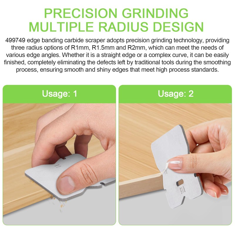 - Precision grinding, multiple radius design: 499749 edge banding carbide scraper adopts precision grinding technology, providing three radius options of R1mm, R1.5mm and R2mm, which can meet the needs of various edge angles. Whether it is a straight edge or a complex curve, it can be easily finished, completely eliminating the defects left by traditional tools during the smoothing process, ensuring smooth and shiny edges that meet high process standards.