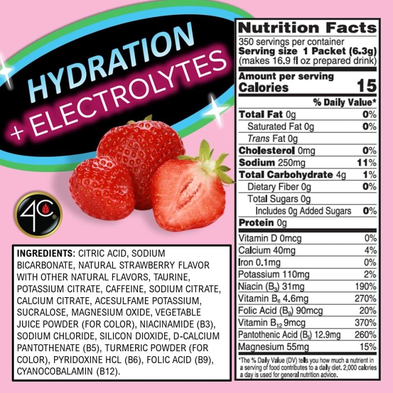 - REHYDRATION ELECTROLYTES | 4C has mastered rehydrating and getting electrolytes quickly into your system with our new Energy Rush Hydration sticks! Perfect for "late night" mornings, groggy days, or prepping for high exertion days. Simply take one right before you enjoy your event, or first thing after to boost recovery! Rehydrate!
