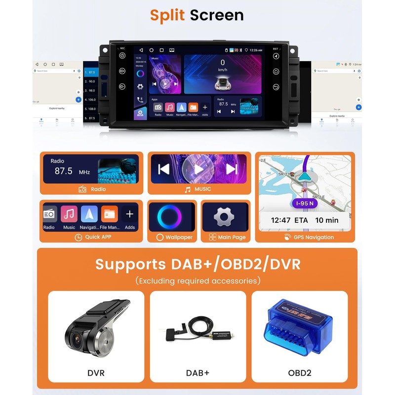 - 🚘Wireless Carplay & Wireless Android Auto & Mirror link: for Jeep Commander car radio support use iPhone or Android phone wirelessly with the device, and control your phone's apps. can make calls, send messages, play music, navigate with just your voice or touch. for Jeep Wrangler radio support IOS/Android mirror link, use USB cable or WIFi, mirror your phone's screen on the device's display, You can use your phone's apps, music, videos, etc on the device.