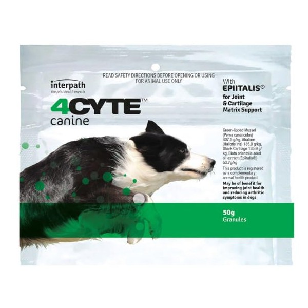 4CYTE Granules for Dogs is the ultimate joint support supplement enriched with revolutionary Epiitalis. It enhances your canine companion’s mobility and vitality. Crafted to nurture joint health from within, these premium granules are a potent blend of science and nature, meticulously formulated to safeguard against joint damage and promote optimal function. Featuring EPIITALIS, a breakthrough plant oil extract patented for its unparalleled ability to stimulate chondrocyte cell proliferation, this oral supplement is designed to repair and regenerate cartilage, making it ideal for managing mild to moderate Osteoarthritis (OA) and post-surgery recovery. Combat stiffness and enhance your dog's agility with ease, as these flavourful granules ensure effortless administration and long-term joint care. Trust 4CYTE Granules to keep your furry friend bounding with vitality, available for purchase in Australia. 4CYTE Granules for Dogs harness the power of Epiitalis, a potent plant oil extract, to revitalize joint health. This unique formulation stimulates chondrocyte cell proliferation, promoting cartilage regeneration and repair. By addressing the root cause of joint issues, such as Osteoarthritis and post-surgery recovery, it enhances mobility and reduces stiffness. Simply administer the flavourful granules daily for long-term joint support and improved vitality in your beloved canine companion.