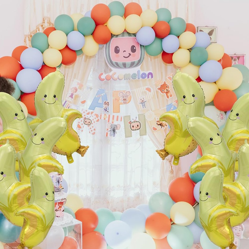 - FRUIT THEMED BIRTHDAY PARTY SUPPLIES ★ Great fruit helium balloons party supplies, banana shape, can be decorated indoors or outdoors, ideal for cartoon themed party, fruit banana themed party, birthday parties, bachelorette parties, graduation ceremonies, carnival parties, class reunions, Christmas decorations, baby showers and other festive party events. It can also be used as a holiday decoration to decorate your home to make the family atmosphere happier. It can also be combined with other balloons to form creative decorations.