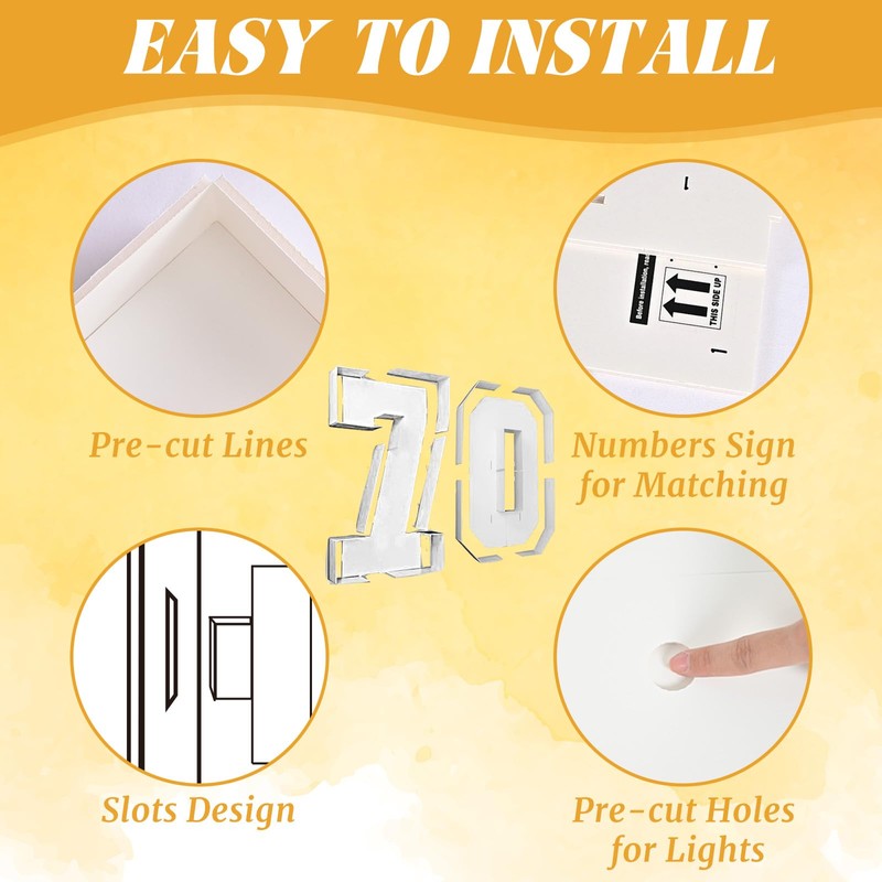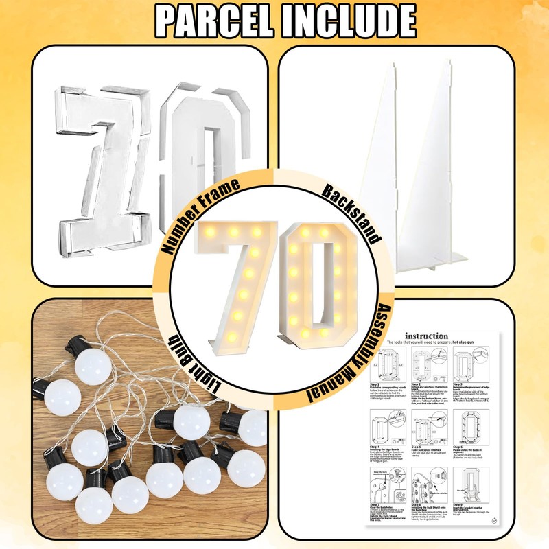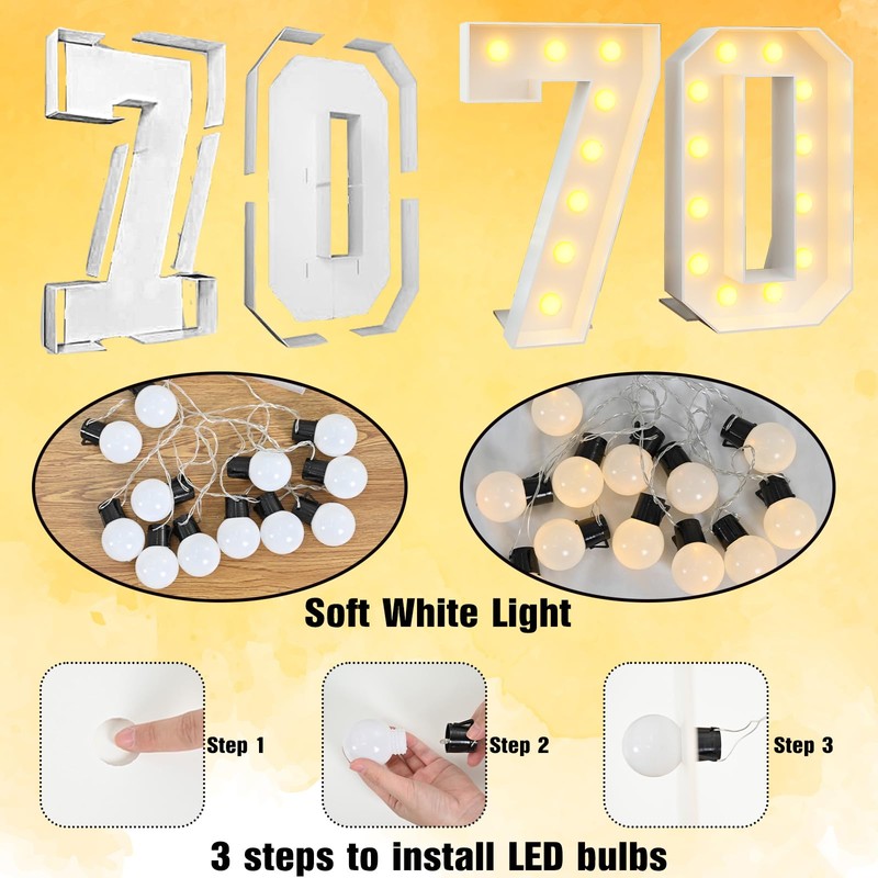 - ENJOY THE PARTY: KAINSY Marquee 70 numbers frame are made of reinforced thick cardboard, which will not easily bend or break, light up number has better bearing capacity, a fixed bracket is installed on the back of each 4ft marquee 70 number, which make the light up number stand more stable, just enjoy your party