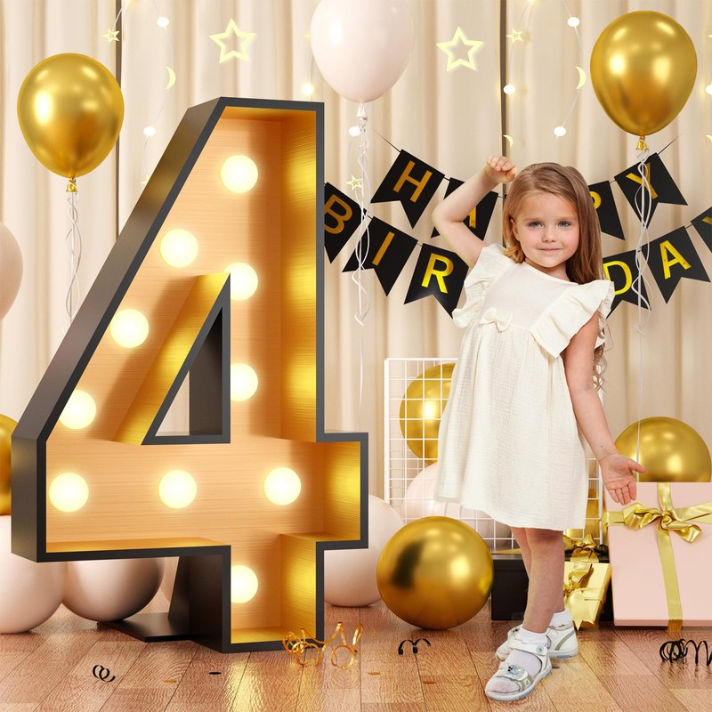 - 【Easy to Install】This black gold 4ft number 4 frame kit for 4th birthday decoration comes with detailed installation instructions, string lights with LED bulbs, and precisely pre-cut foam board and double-sided tape. With our splicing installation manual, you can install the frame as easily as building blocks and enjoy DIY fun. You can also use a hot glue gun to reinforce the frame for added reinforcement.