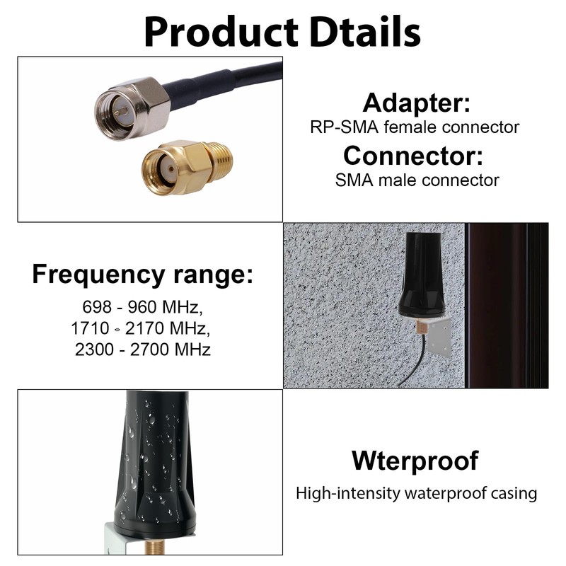 - Frequency Range: 698-960MHz, 1710-2170MHz, 2300-2700MHz; Gain: 5dBi; Omni-directional; Waterproof: Rainning Proof; Feature: Fixed Wall Mount; Thru Hole Mount; Antenna Thru Hole Mounting Screws Diameter: M12 11.76mm-11.95mm; 3m Low Loss KSR195 Coaxial Cable; Antenna Connector: SMA Male; with SMA Female to RP-SMA Male Adapter and SMA Female to Dual TS-9 Male
