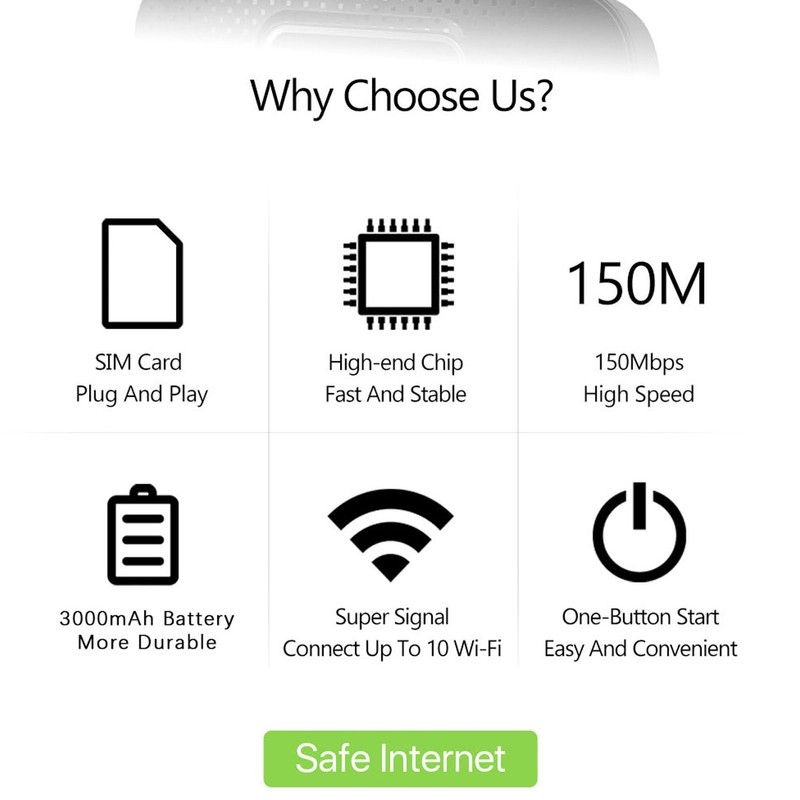 - 300Mbps: 4G LTE up to 300Mbps; Portable WiFi Router support multiple terminals to access the Internet at the same time, support 10 devices, support cell phones, tablets, laptops, computers, smart TVs and other devices to access the Internet.