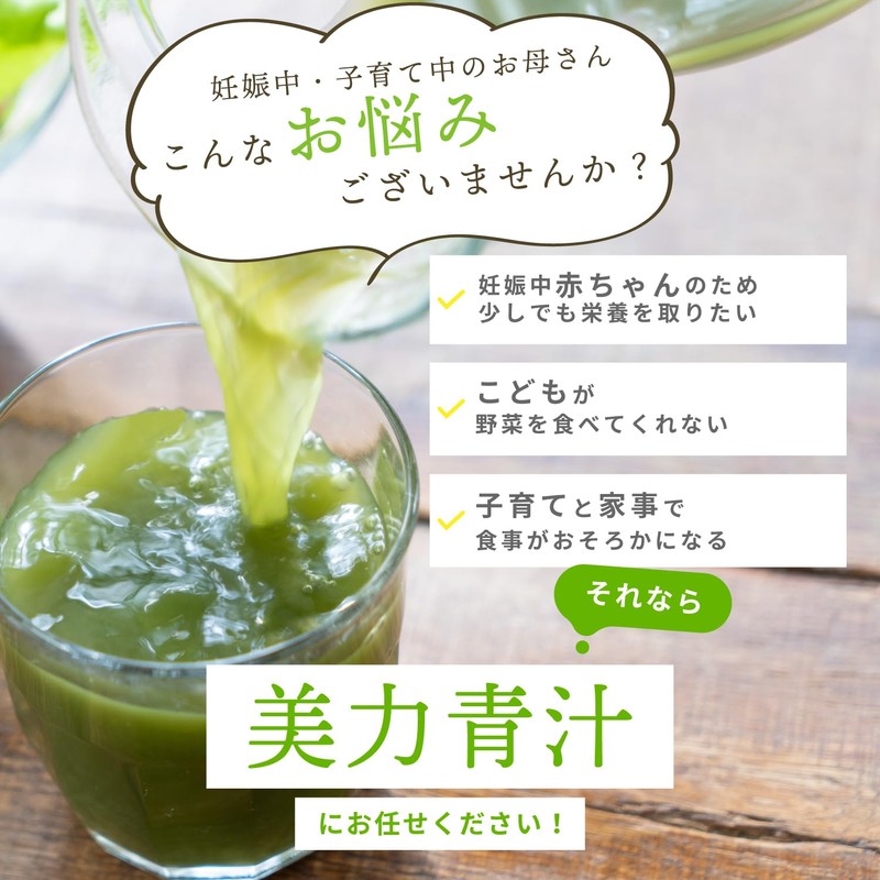 • ◆妊娠中や授乳中の健康をサポート 美力青汁は、1包に葉酸を200マイクログラム配合する栄養機能食品。葉酸は胎児の正常な発育に寄与する栄養素。また、妊娠中に不足しがちな鉄分をプルーン28個分も配合。個包装で携帯に便利だから、お出かけ先でも手軽に栄養補給