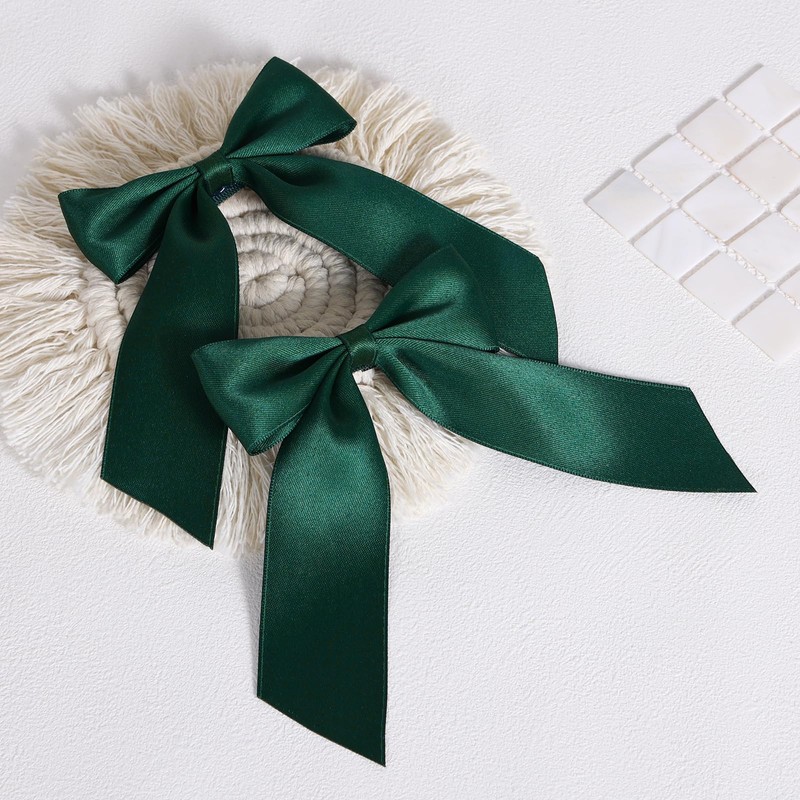 4in Dark Green Silky Satin Bow Hair Clips for Girls, 2pack Silky Satin Ribbon Tassel Bow-Knot Ponytail Barrettes, Metal Alligator Hairpins with Long Tail Handmade, Stylish Elegant Hair Styling Accessories for Teens, Toddler, Kids, Women, Birthday Gift