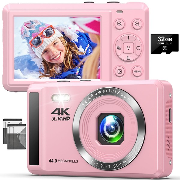 4K 44MP Digital Camera for Photography - 16X Zoom - Portable Vlogging Camera Includes 32GB SD Card & 2 Batteries for Kids, Teens, Beginners