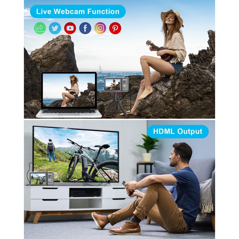 - 📷【Live Streaming & Webcam】This 4K digital camera can be used as a webcam. Simply connect it using a USB cable and switch the camera to "webcam" mode. It enables easy live streaming or video calls on platforms like YouTube, Facebook, Twitter, or other social media. It also supports external standard-sized tripods.