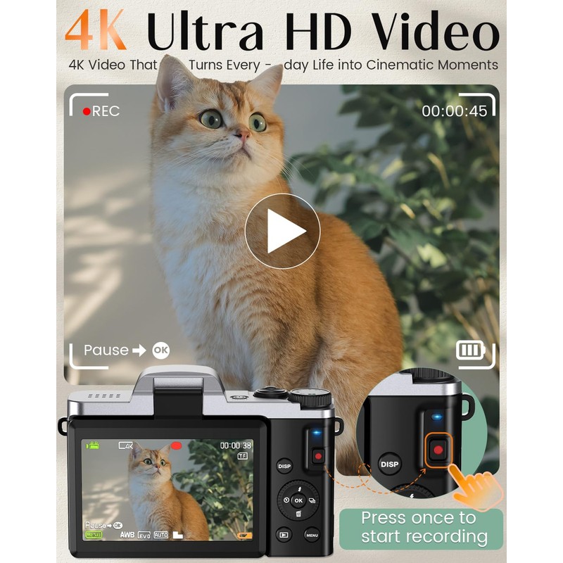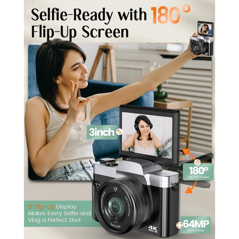 - 【3.0” 180° Flip Screen for Vlogging】 This 4K camera is designed for content creators, featuring a 3.0-inch IPS 180° rotatable flip screen that allows you to preview your shots from any angle, It is perfect for selfies, vlogs, and creative shooting. The built-in microphone ensures clear sound quality, Switch to webcam mode to enjoy live streaming, online classes, video chats, or YouTube content creation, making it an ideal choice for vloggers, beginners, and teenagers.