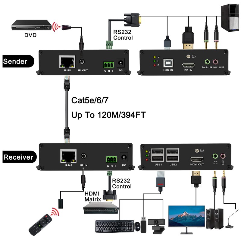- 4K DP to HDMI KVM Extender: The dp kvm extender extends video(sender DP input, receiver HDMI output), stereo audio, microphone, USB and RS232 serial port signals up to 394 ft (120m) over single Cat5e/6/7 cable. No video loss with zero delay with EDID pass-through