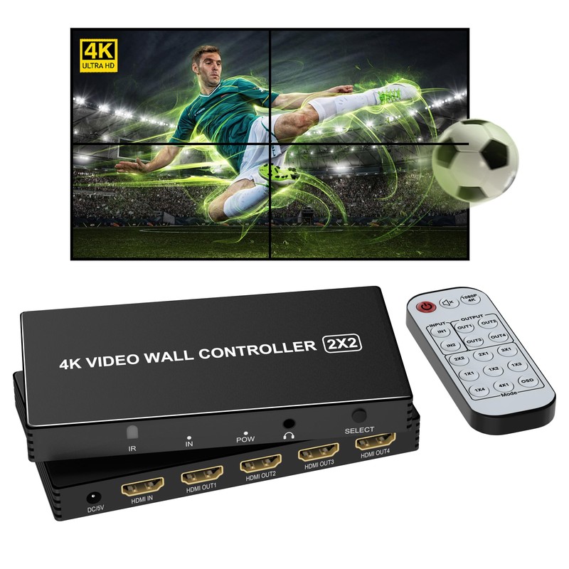 - [2X2 HDMI Video Wall Controller] Video wall controller supports HDMI input and 4 HDMI output, the main function is to divide a complete HDMI 4k image signal into 4 hdmi output display (such as rear projection unit, LCD TV, etc). Complete with 4 HDMI HD video display units to form a large dynamic image wall.