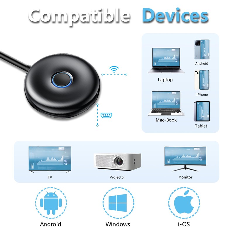 - Wireless and Easy Connection:This wireless presentation receiver no app, easy to set up.Bear in mind you will need a 5V/2A power source for the included usb cable. Many modern TVs and Projectors have a USB port near the HDMI input and that will work for this device. If the port is occupied, a battery pack will work.