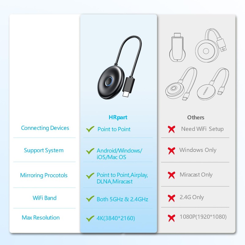 - Why choose the HRpart wireless display adapter/receiver?It will allow you to view audio, video, office documents and more from a small to a large screen without the need for long and messy cables. Share your file content, photos, videos on any TV, monitor, projector with HDMI port, perfect for presentations, meetings, exhibitions, etc.