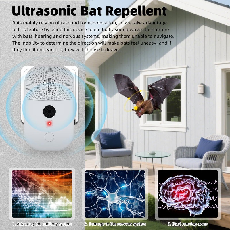 - 🦇Energy-Efficient & Simple Protection: Featuring an energy-saving design, the best bat repeller operates 24/7 on minimal power for cost-effective bat control. Installation is effortless: simply plug into any standard outlet and activate the switch for immediate, maintenance-free operation safeguarding your property.