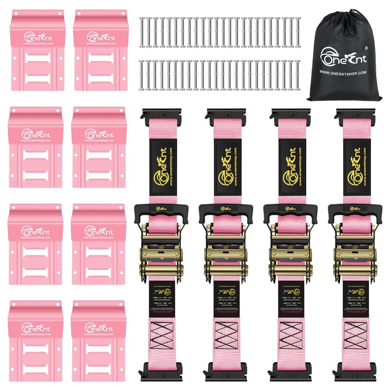 Onesnt 4Pcs 2” x10 ft E Track Ratchet with Wheel Chock Kit tie Down Straps for 4800 lbs Break Strength Heavy Duty Cargo Strap System Tie Down|E-Track Spring Fitting for ATV, UTV - Pink