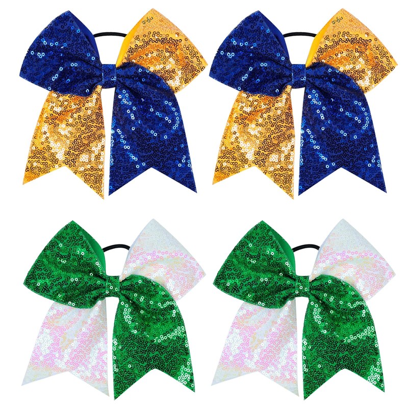 4PCS 6.7Inch Cheer Bows,Large Sequins Cheerleading Bow Ponytail for Women,Blue and Gold Cheer Hair Bows Elastic Band for Sports Cheerleader Team Outfit Uniform Accessories