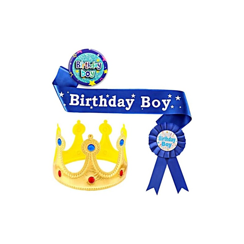 - Full Set: 1 * blue and gold crown, 1 * blue and white badge,1 * blue happy birthday pin,1 * blue and white belt.The blue and gold birthday set is perfect for birthday parties, providing the perfect combination for unforgettable birthday decorations