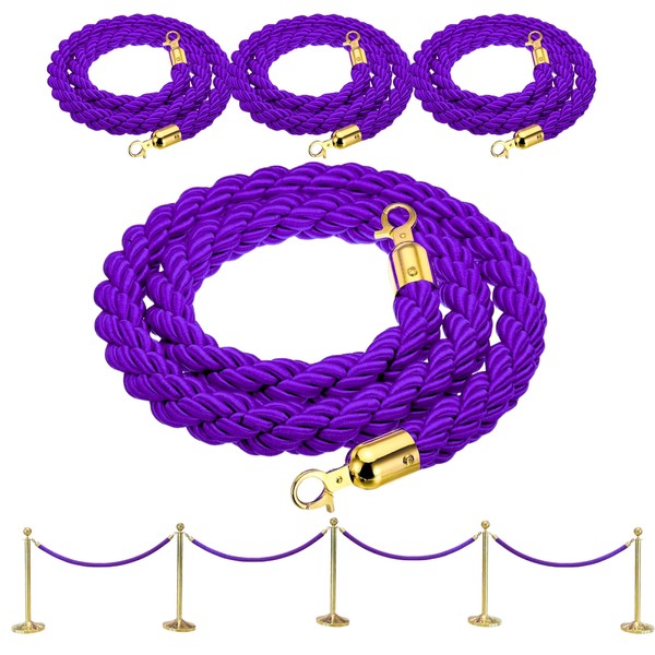 4PCS Braided Purple Rope – 5FT Rope Twisted Barrier Cord with Gold Hooks VIP Set Crowd Control Stanchion for Event Decor and Party Stanchion Posts