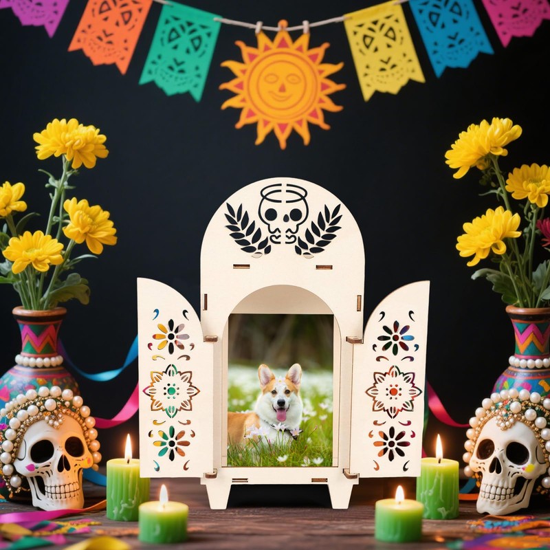 - Photo Frame Style Design: carved by traditional Mexican Papel picado,It contains patterns such as skulls and marigolds,the portrait-friendly frame design beautifully displays photos of loved ones, creating a meaningful centerpiece that keeps their memory alive in a visually striking way