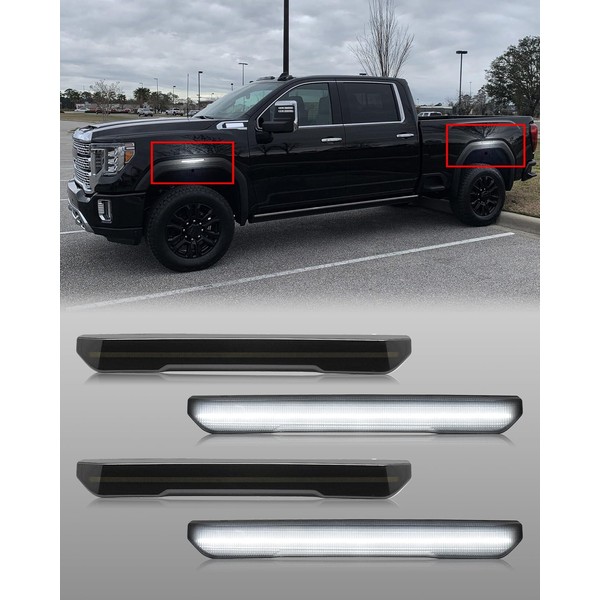 4Pcs Front & Rear LED Side Marker Light Compatible with Sierra 2500HD 3500HD 2020-2024 Pickup Side Parking Position Lamp Driver Passenger Front Rear Turn Signal Lamp (Smoked Lens Full White Light).