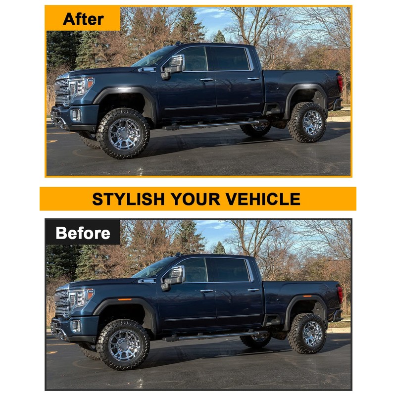 - 🔧【Easy Installation】: Plug and Play to install in just minutes, OEM Perfect fit and direct replacement. Simply remove original light and replace with the new housing light, connect the upgrade version lights plug into the factory socket and finish. No modification or trimming require. Upgrade design for your dual rear wheels well arch repeater side markers; Upgrade your Sierra with a new fashion cool style front and rear led side marker light and elevates your Truck's aura.