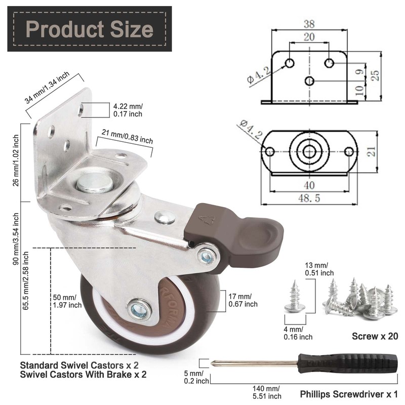 - [Castor Wheels with 2 Brakes] There are 2 types of castors wheel in this set, a wheels without brake and a swivel castors with brake. A combination of castors furniture without brake and brake castors keeps your furniture firmly docked in one place.