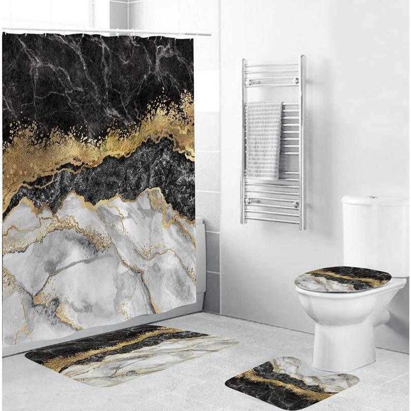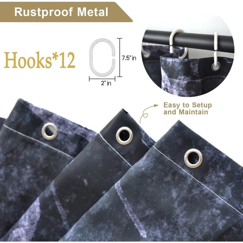 4Pcs Marble Shower Curtain Sets, Bathroom Sets with Shower Curtain and Rugs and Accessories, Rug Toilet Lid Cover and Non-Slip U Shape Mat, Waterproof Black Shower Curtain with 12 Hooks, 72" x 72" - Color: Black-2