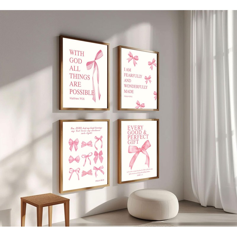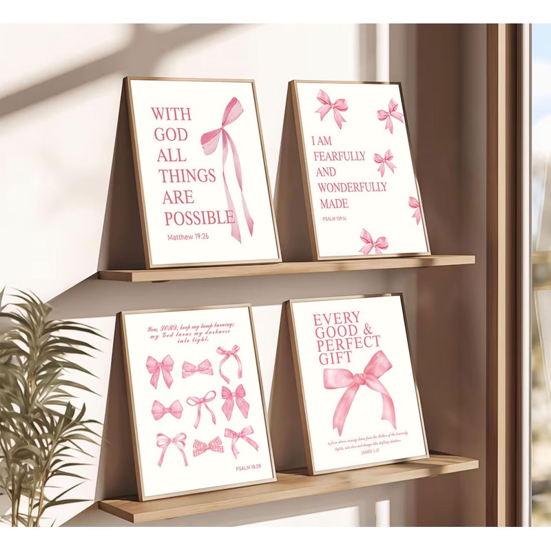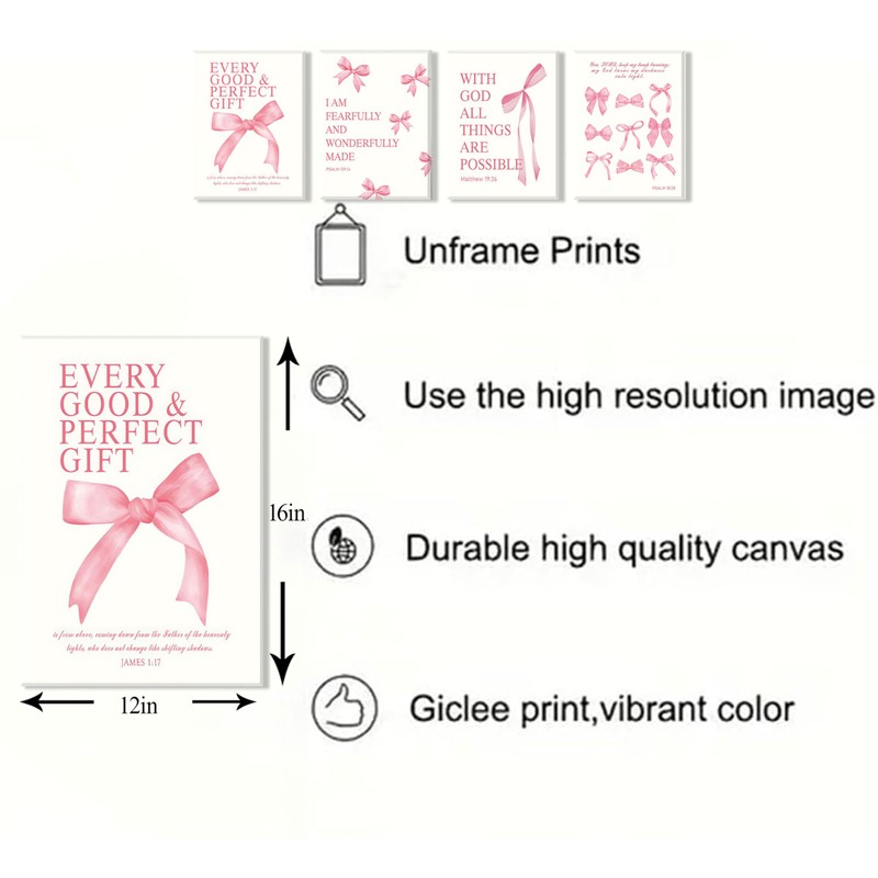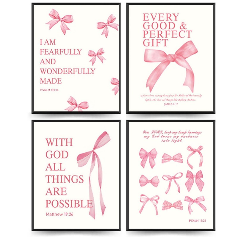 - Pink Bow Bible Verses Wall Art : Pink Bow Bible Poster set of 4, Size is 16L x 12W,Each poster is of uniform size,You can choose the appropriate size according to the wall, which is convenient for display as a set and creates a harmonious visual effect.