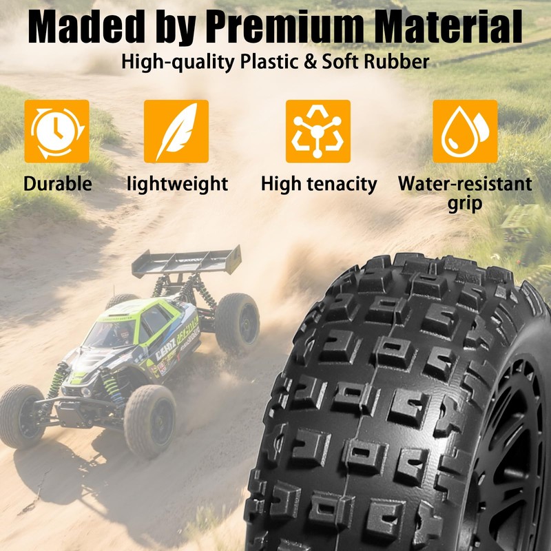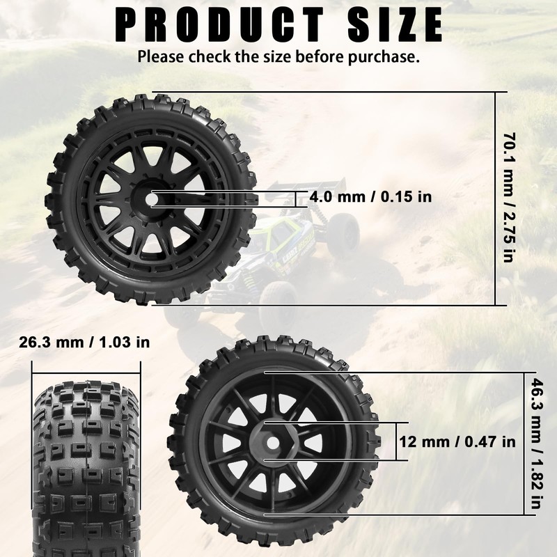 - 【Tips】 Before purchasing, please check if our tire size is compatible with your RC car. If you have any question, please contact us, we will solve the problem as soon as possible.