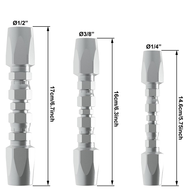 - 1/4 inch reusable hydraulic fittings fit for 1/4" ID, approx. 0.63" OD - #04 Hose;< br > 3/8 inch reusable hydraulic fittings fit for 3/8" ID, approx. 0.73" OD - #06 Hose; < br > 1/2 inch reusable hydraulic fittings fit for 1/2" ID, approx. 0.92" OD - #08 Hose; < br >