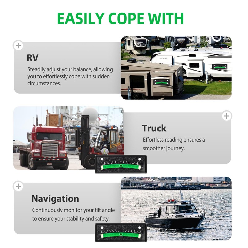 • 🔹 Precise Tilt Measurement – Each level features a tilt range from -7 to +7 degrees, providing accurate leveling data. Graduated markings indicate the exact number of inches needed to raise or lower your RV or trailer for perfect balance.