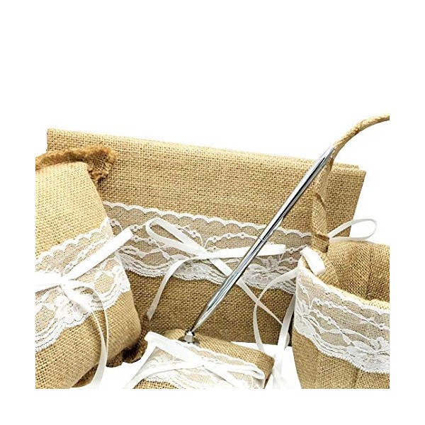 4Pcs/Set Burlap Wedding Guest Book + Pen Set +Flower Girl Basket + Ring Pillow (Burlap)