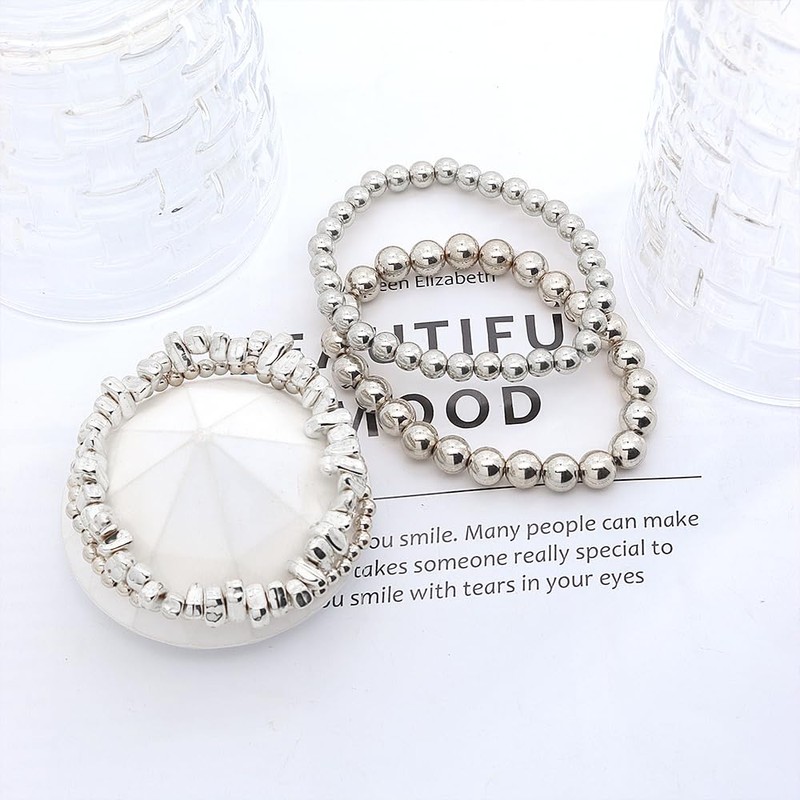 4Pcs Stackable Beaded Layered Bracelet Set for Women Irregular Gold Plated Geometric Chunky Metal Stretch Bracelet Minimalist Statement Jewelry Gift (Silver)