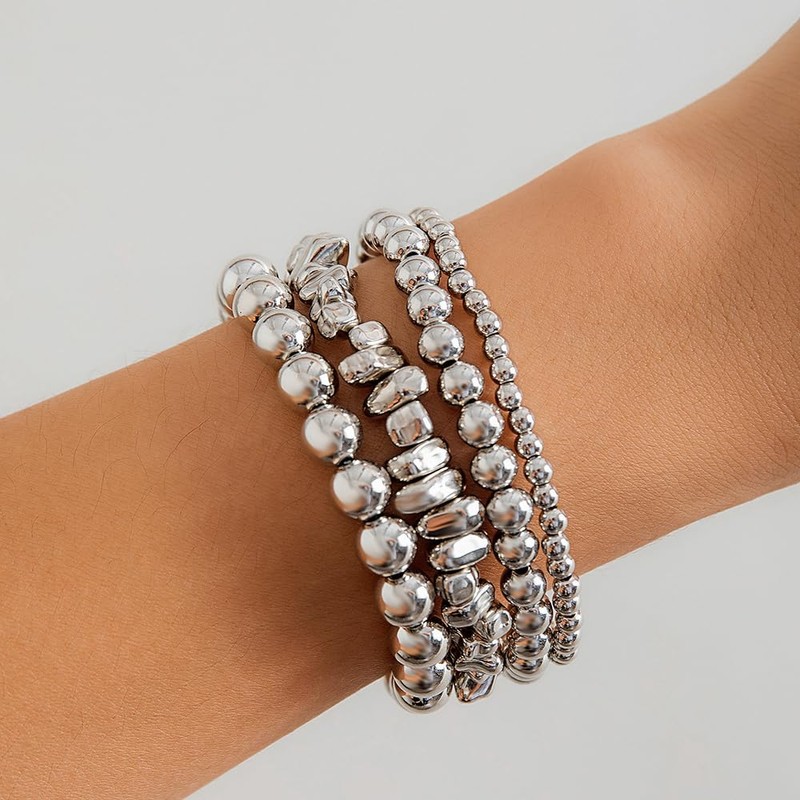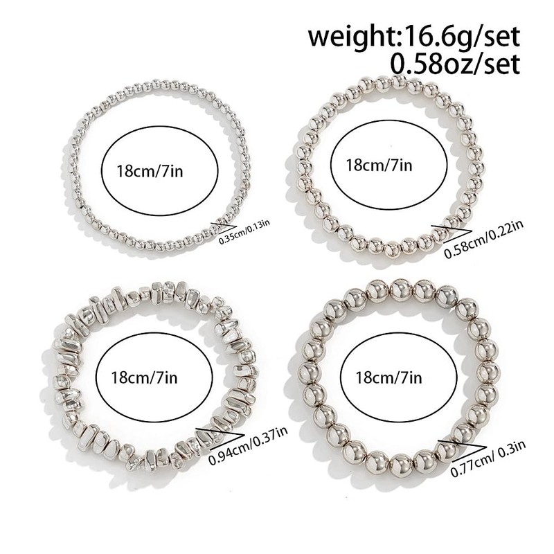 4Pcs Stackable Beaded Layered Bracelet Set for Women Irregular Gold Plated Geometric Chunky Metal Stretch Bracelet Minimalist Statement Jewelry Gift (Silver)