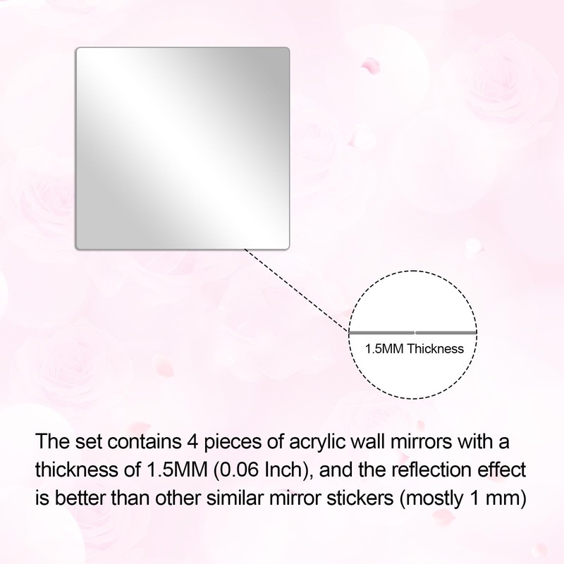- 1.5MM Thickness: The set contains 4 pieces of acrylic wall mirrors with a thickness of 1.5MM (0.06 Inch), and the reflection effect is better than other similar mirror stickers (mostly 1 mm)