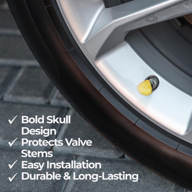 4PCS Valve Stem Caps | Durable Plastic Tire Valve Covers w/ Unique Bold Skull Design | Weatherproof, Corrosion-Resistant, & Easy to Install | Universal Fit for Cars, Motorcycles & Bicycles | Yellow