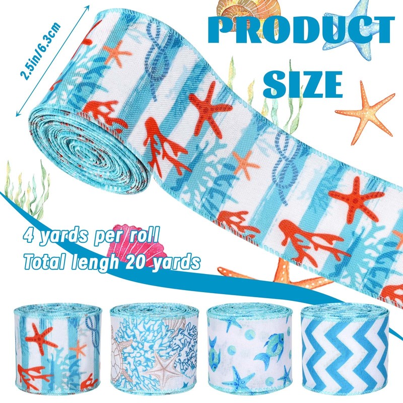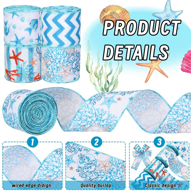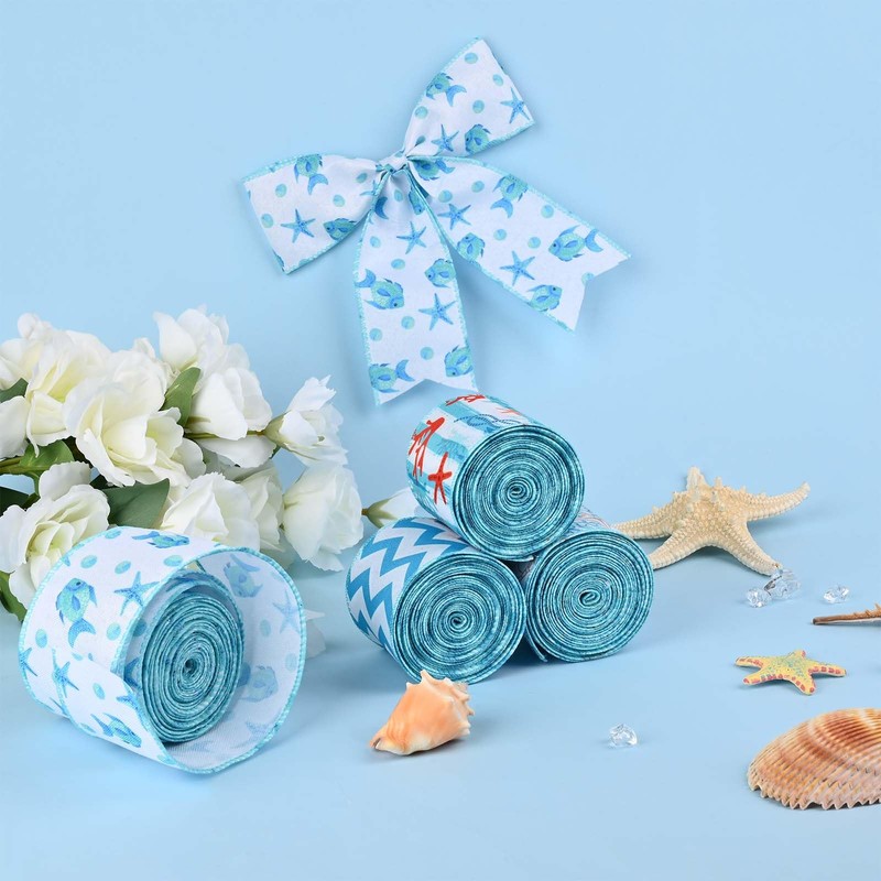 4Rolls 20 Yards Ocean Themed Wired Edge Ribbon Blue Coral Starfish Waves Patterned Burlap Ribbon for Gift Wrapping Bow Wreath Making for Summer Holidays Baby Shower Craft Supplies