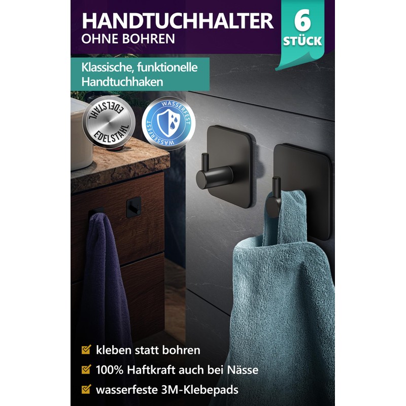 - Towel holder black without drilling, 6 pieces in a set – waterproof wall hooks self-adhesive with 3M adhesive pads; simple hooks without drilling with high adhesion and load capacity
