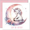 4th Birthday Card for Girls - Beautiful Crescent Moon & Unicorn Birthday Card for 4 Year old Kids four, fourth