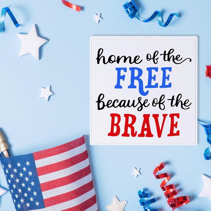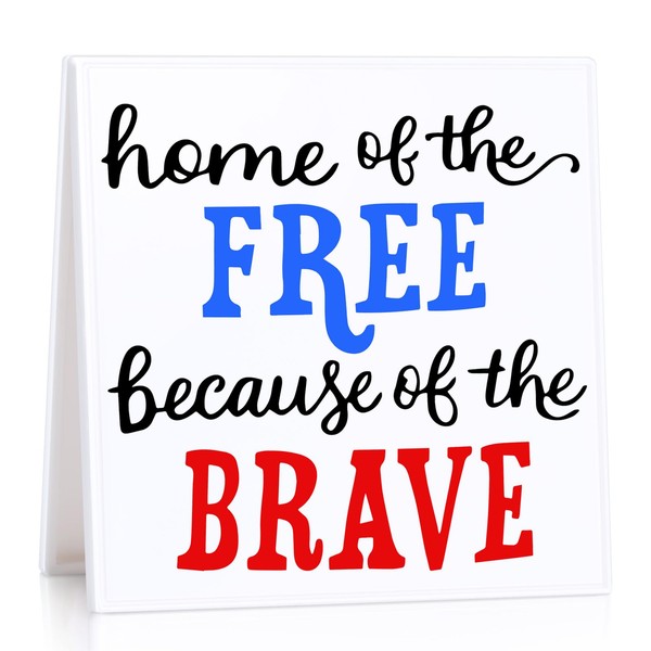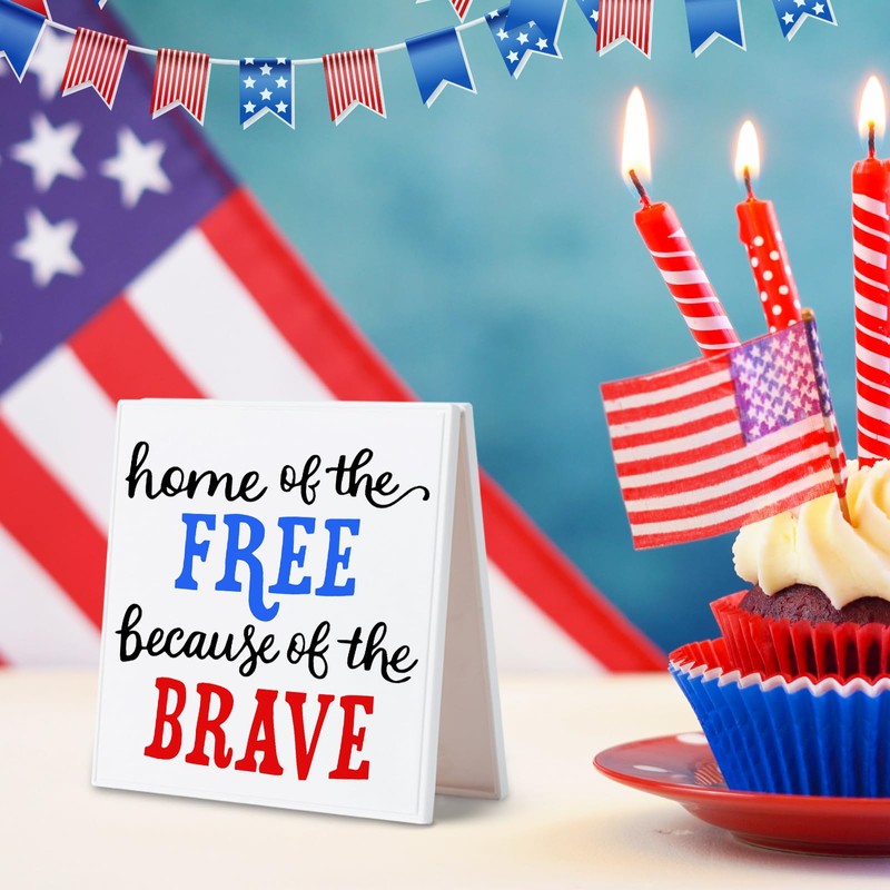 4th of July Decor Patriotic Desk Sign Home Of The Free Because Of The Brave Square Plastic Decoration for Independence Day July 4th American Flag Block Sign Table Decorations