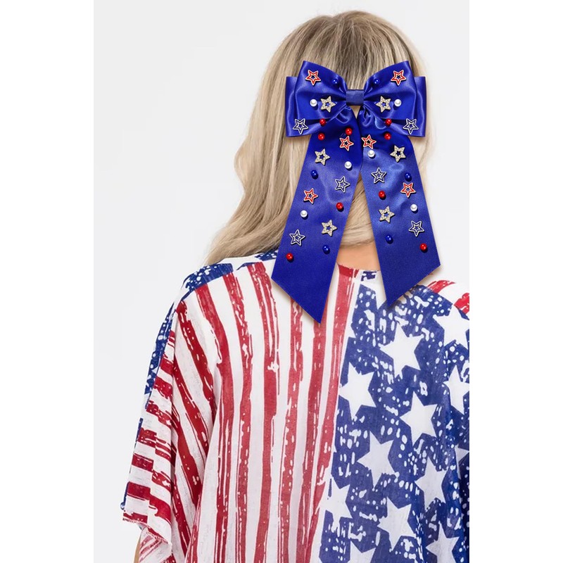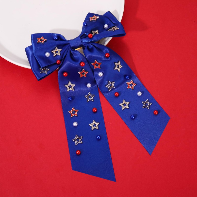 - American Flag Hair Bows:What's better than a sparkling red white and blue 4th of July hair bow clips for women for paying homage to the Star-Spangled Banner?Dress in the spirit of the nation with these USA hair bows.Features classic bowknot design accented with red white blue sparkling rhinestone enamel star and USA charms and pearls.Adding a little bit of sparkle and let this rhinestone American flag pearls stars USA hair bow clips to show at your next patriotic celebration!