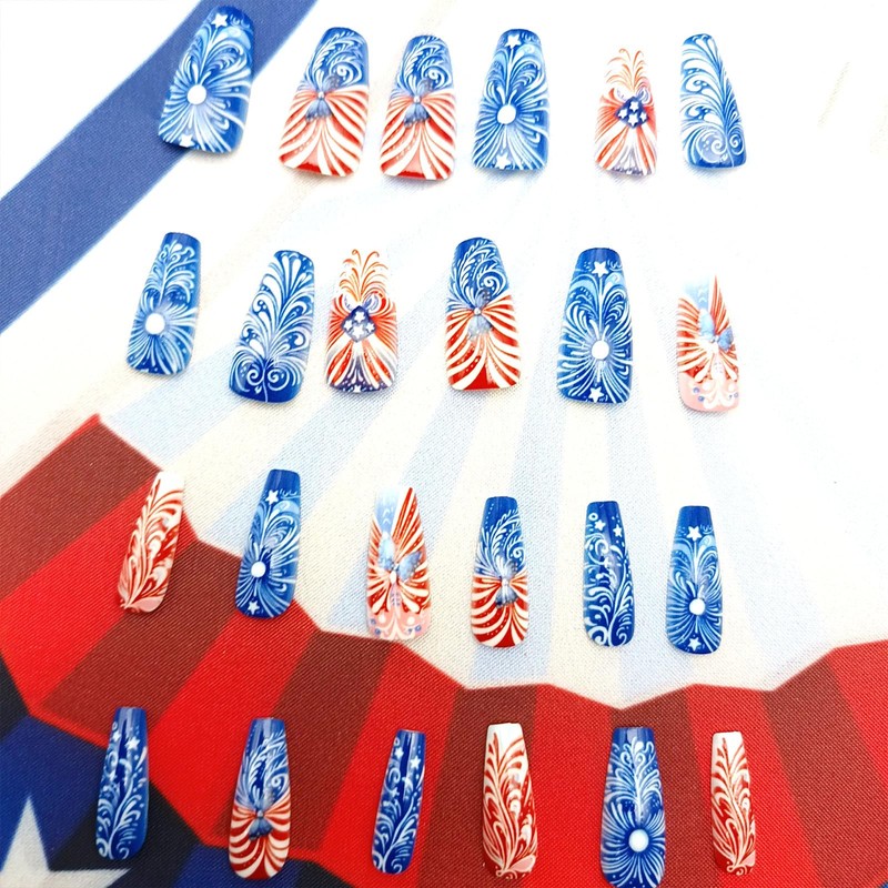 4th of July Press on Nails Independence Day Fake Nails Star Lines Butterfly Glue on Nails Red Blue False Nails Medium Coffin Nails Press ons Acrylic July 4th Artificial Stick on Nails for Women 24Pcs