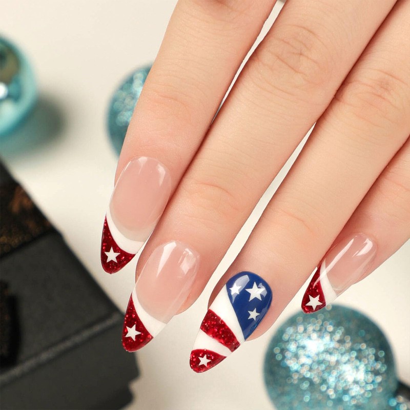 4th of July Press on Nails Medium Almond Fake Nails with American Flag Designs Red French Independence Day Glue on Nails Press ons Independence Day False Nails Stick on Nails for Women 24 Pcs